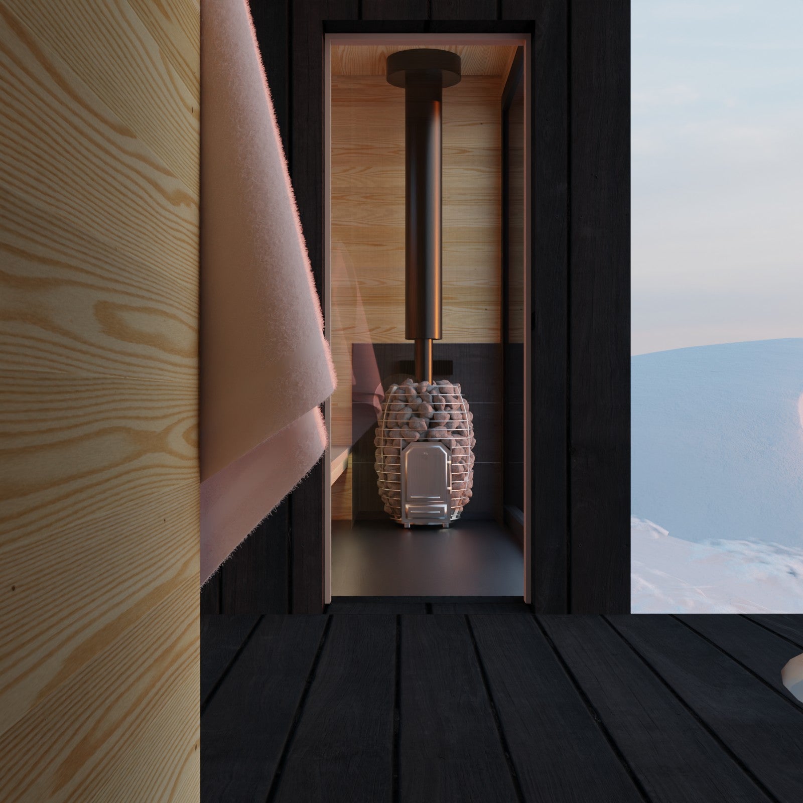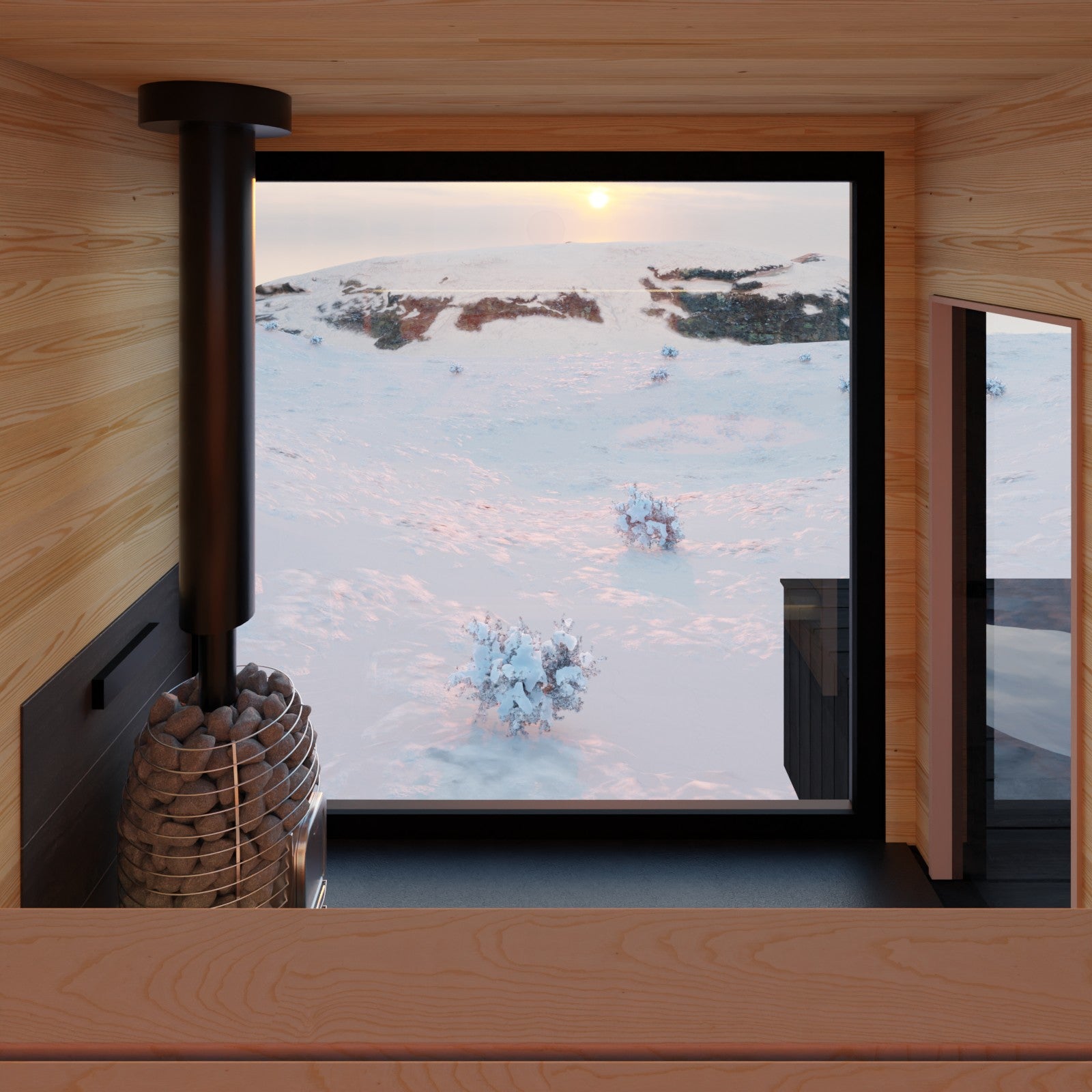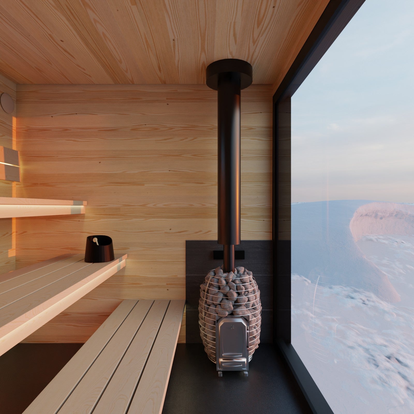 Inside the sauna, there's a big window that goes from the floor to the ceiling. You've got three levels of benches to sit on, and a wood stove that you can load up from inside the sauna itself. The ceiling is pretty high, which makes superior 'loyly' – it's extra good because of the small difference in temperature between your feet and your head.