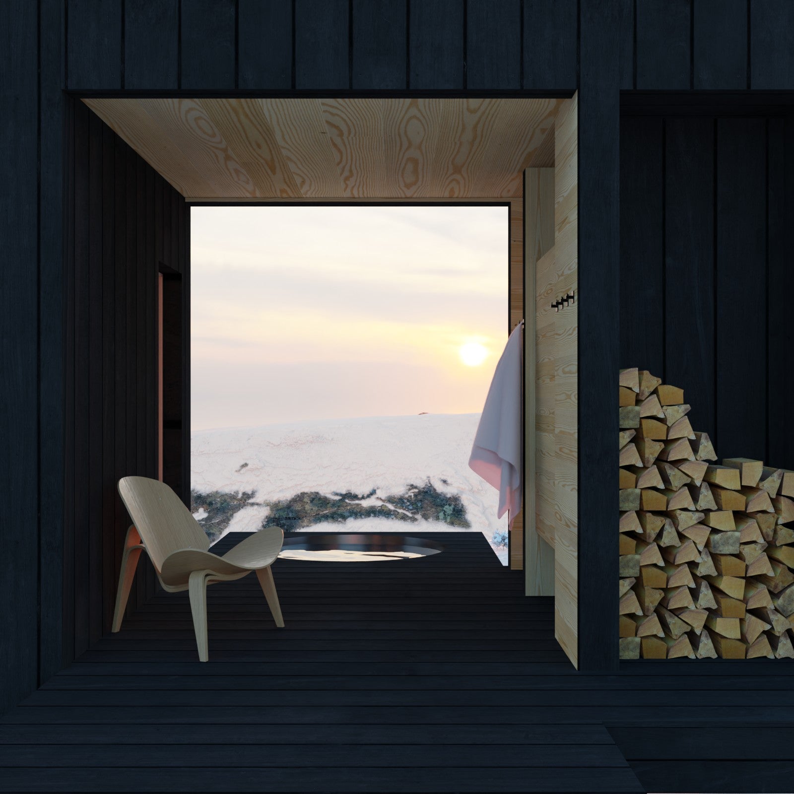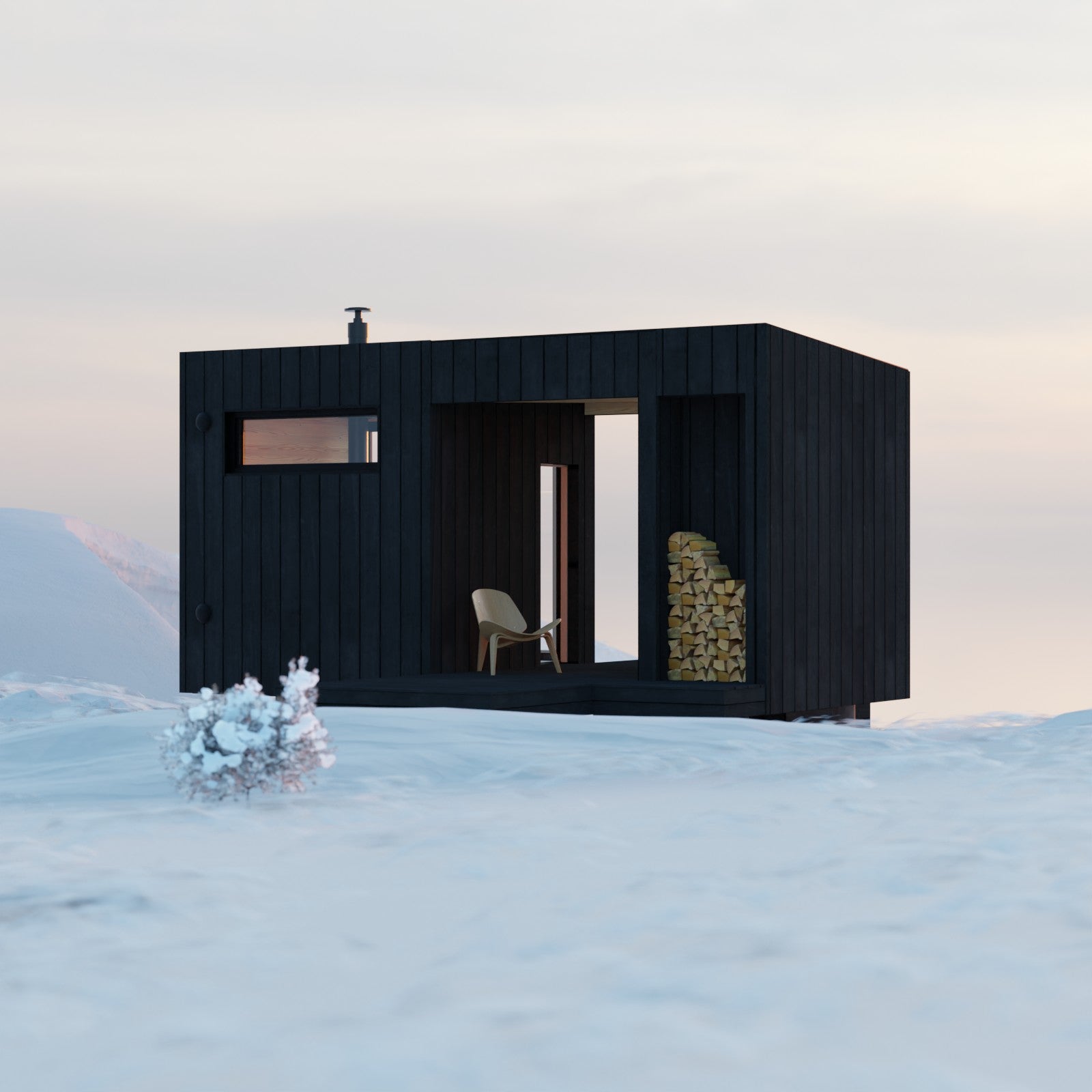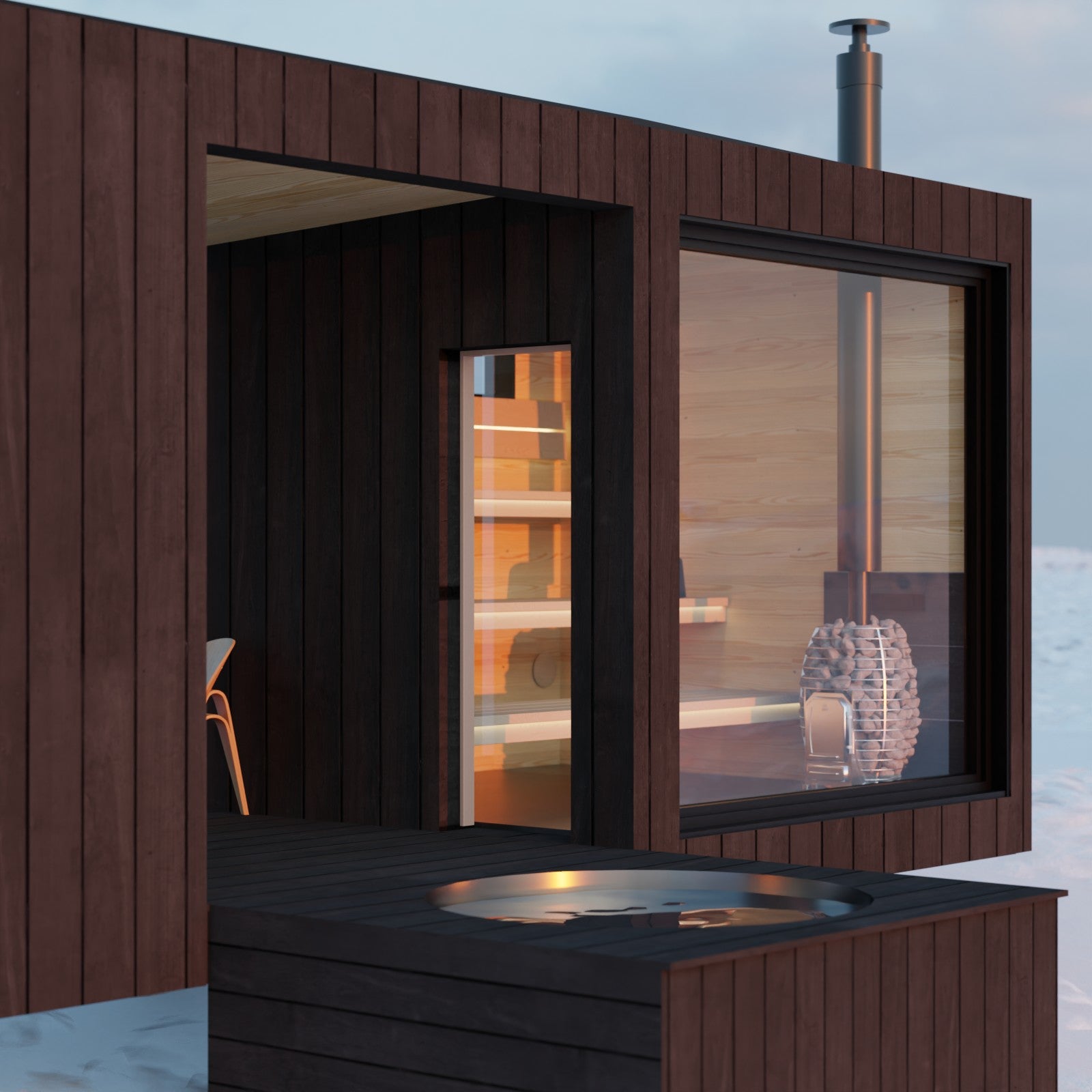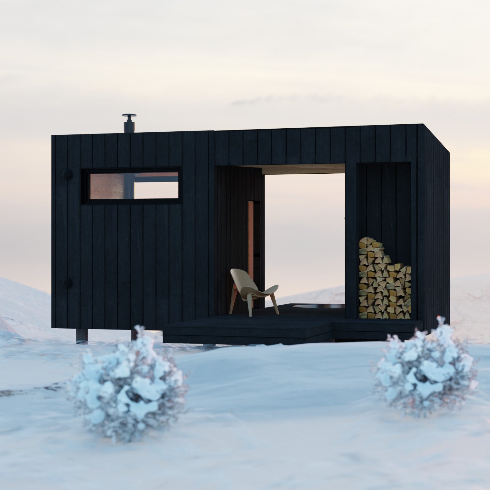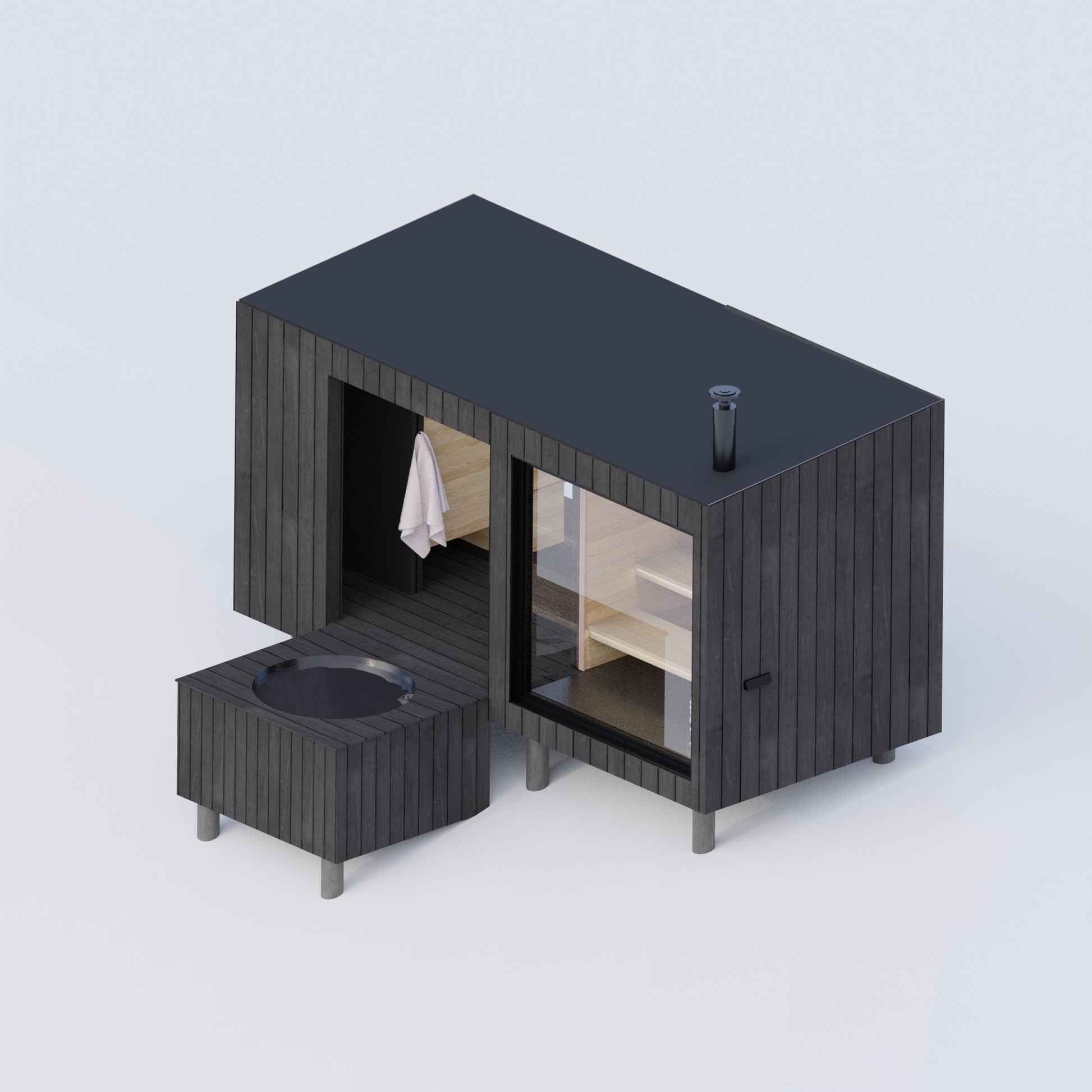 This sauna is a great choice if you've got awesome views, or if your property is on a slope. "Varme" means "warm" in Danish. The main form of the building is split by a void form, creating a covered patio.  This patio has a nice spot to take a shower and change, plus a place to stack up firewood for when you're using the sauna.