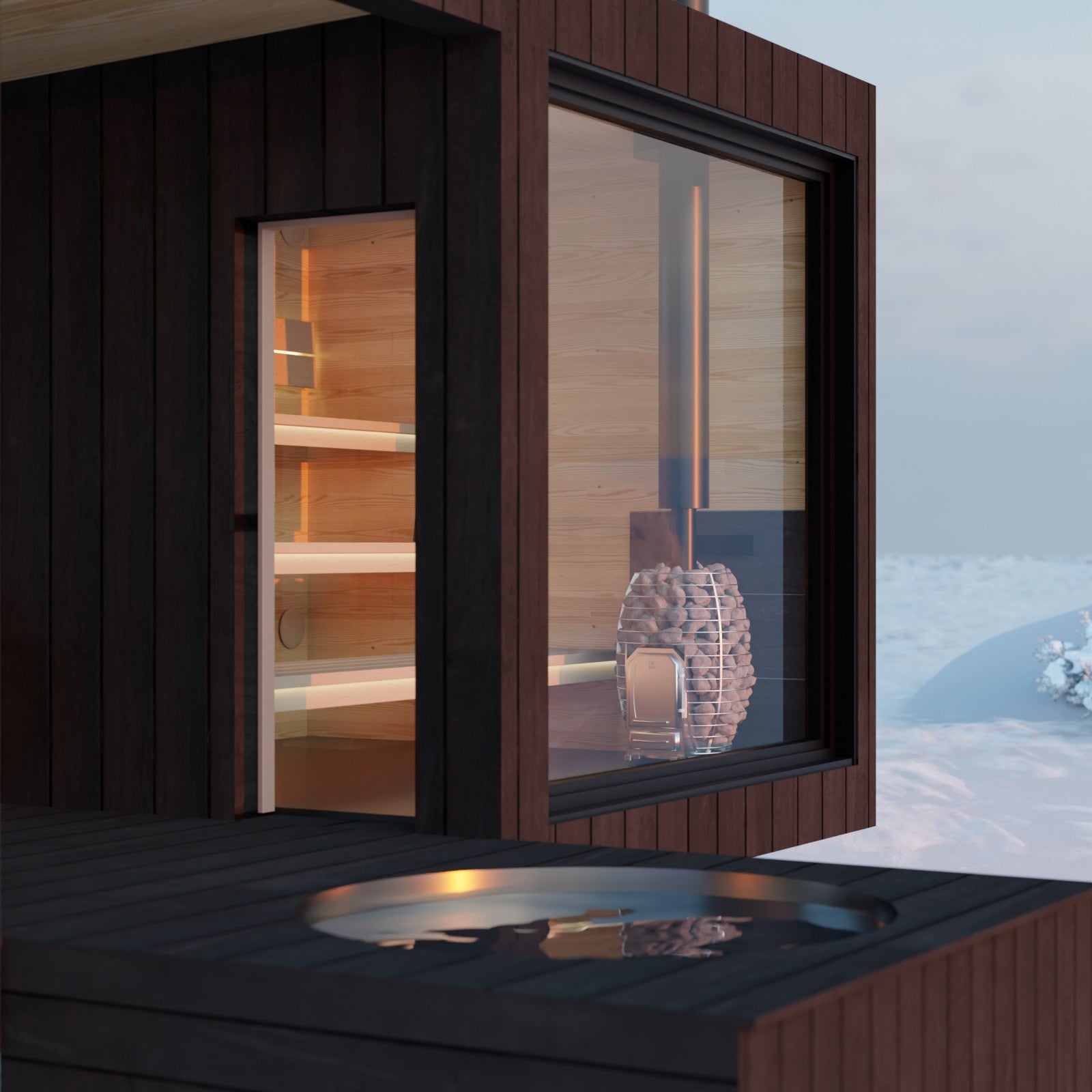 Right across from the patio entrance, there's a cold plunge pool where you can cool off after a sauna session. If you are not fond of cold baths, you can also swap them for a hot pool.