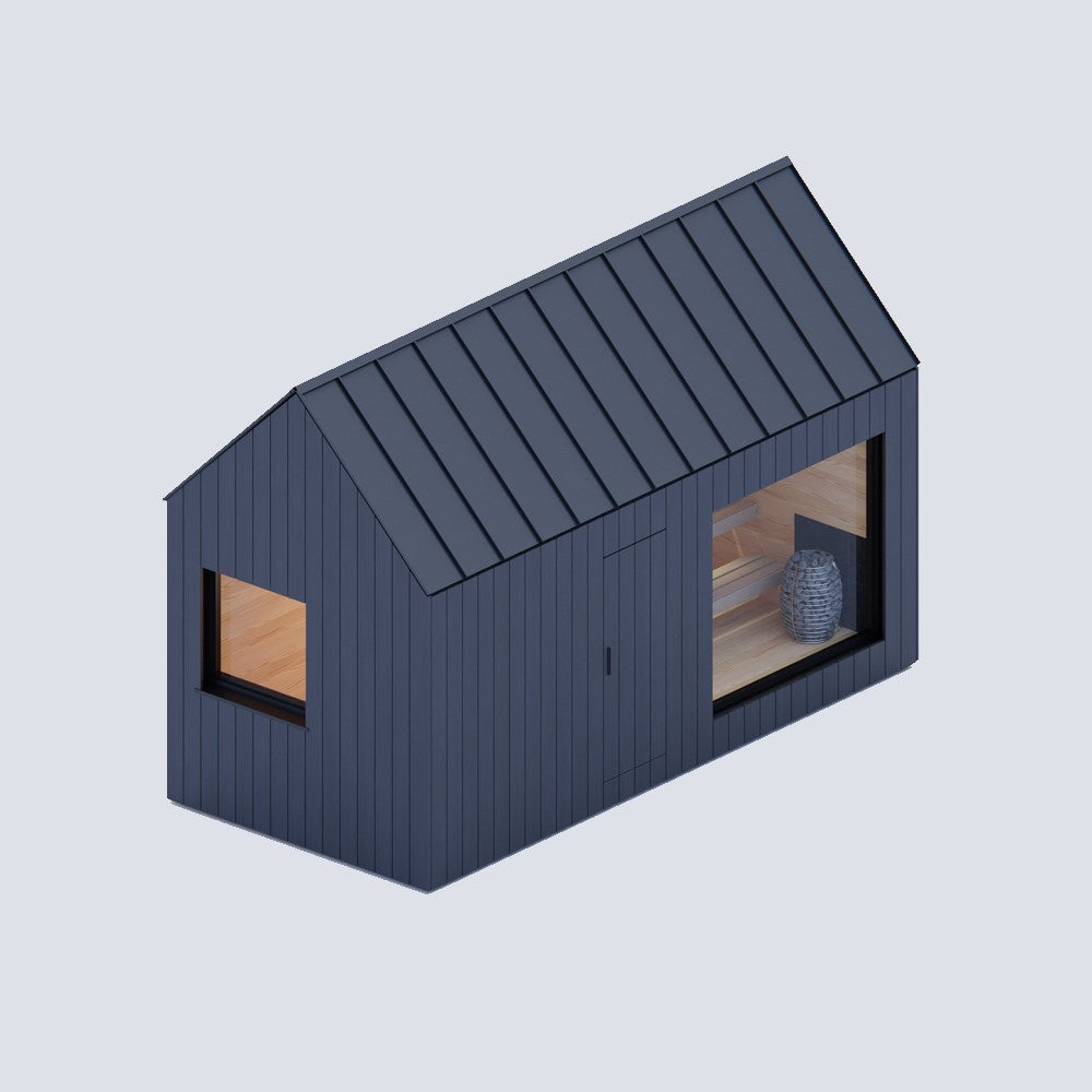 Sauna Skadi is one of our bigger sauna designs. Use it as a chill out space, yoga studio, garden office and, of course, a sauna. We increased the ceiling height to 8'6 (2.5m) and added a third level of the bench. The changing room also got bigger, so now you can relax in a full size lounge chair. Skadi is a Scandinavian goddess associated with winter, skiing, bow hunting and mountains.