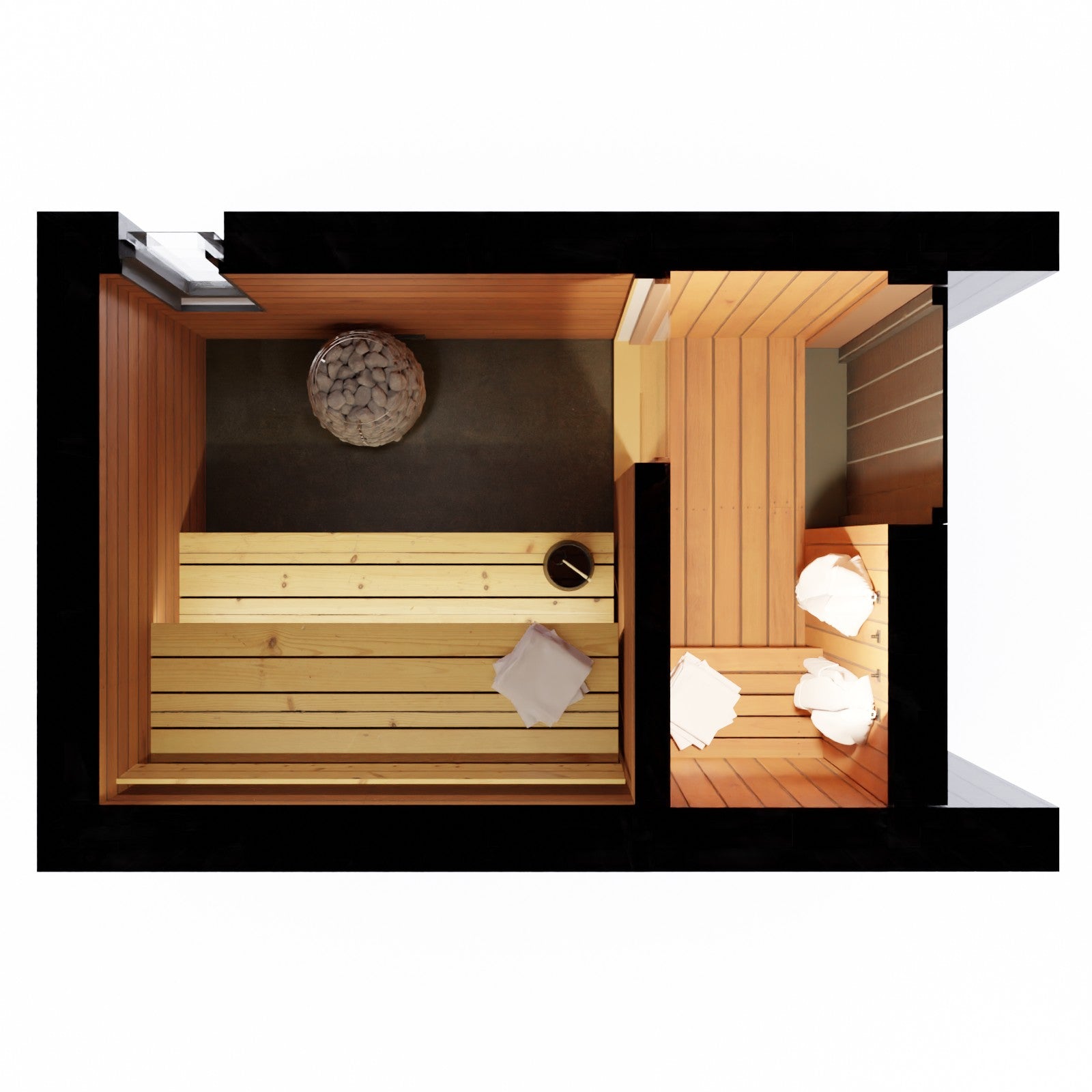 Sauna Luuta has only what is essential for a great sauna. It is big enough for 4-5 person family. The changing room allows you to change without standing in the cold. The small window in the sauna means less heat loss, while still maintaining views to the outside.